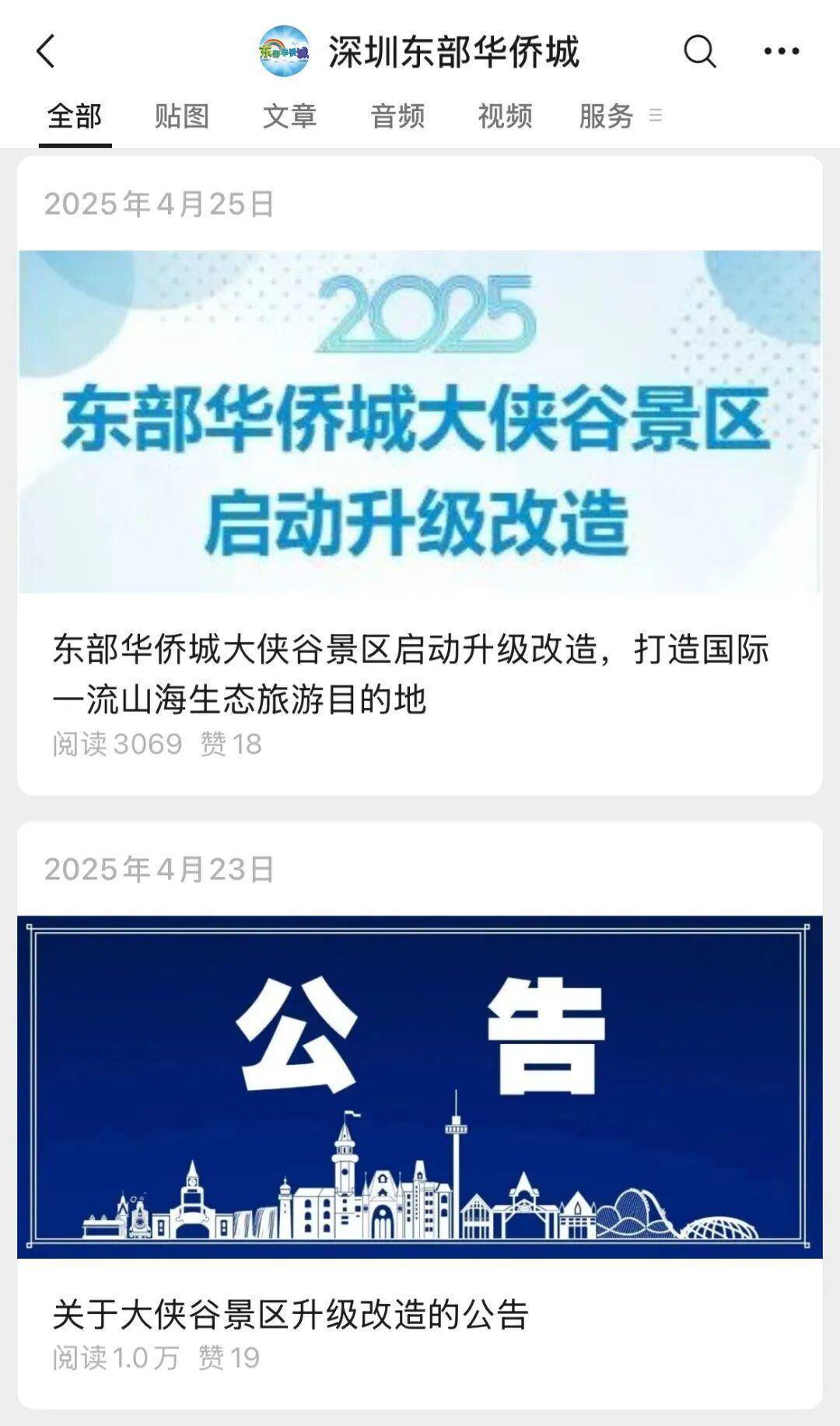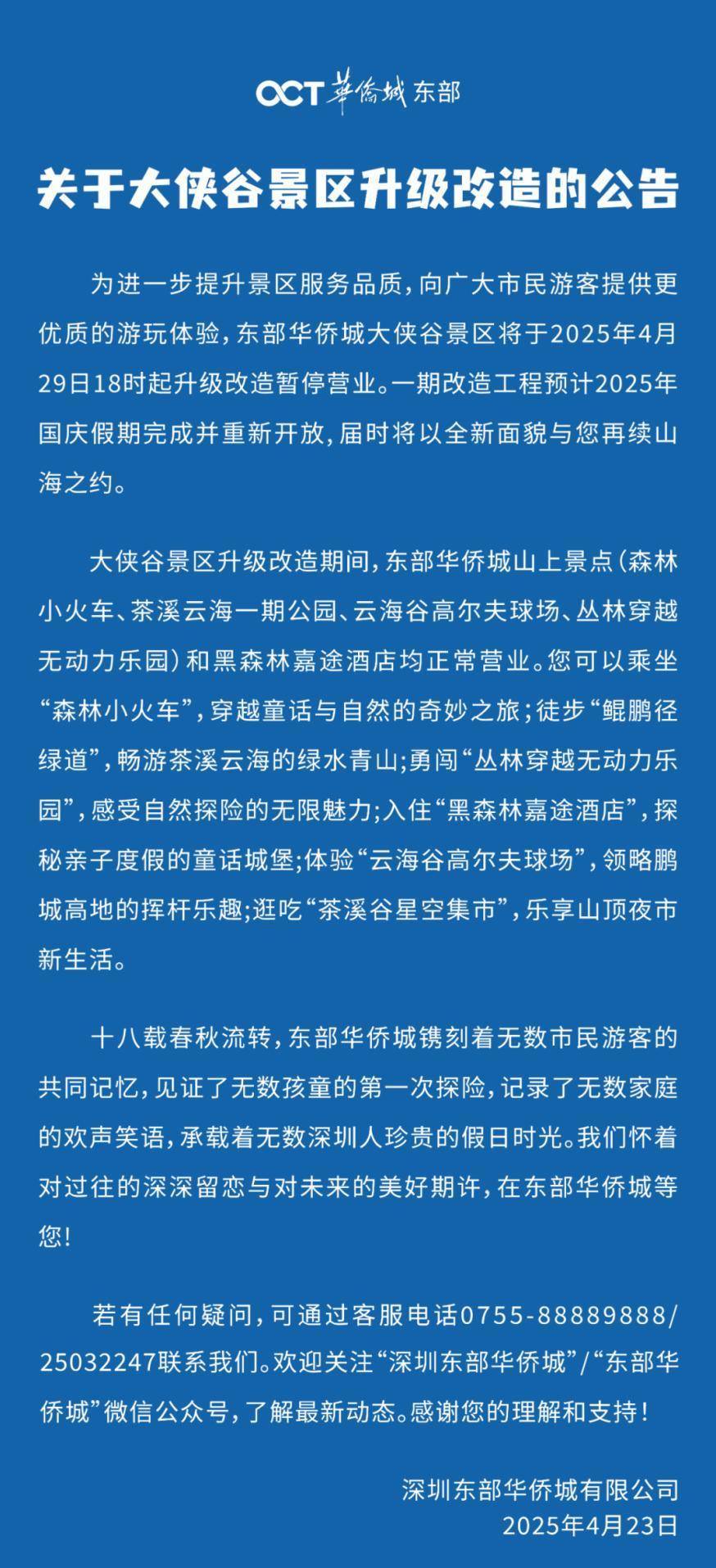 深圳新闻网记者查询到,2025年4月,深圳东部华侨城微信公众号曾发布《关于大侠谷景区升级改造的公告》(此前报道:深圳知名景区4月29日起暂停营业)。公告内容显示,大侠谷景区于2025年4月29日18时起升级改造暂停营业。